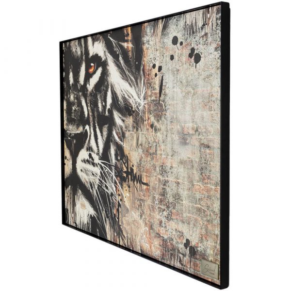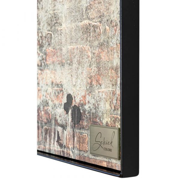 stabilen, matt schwarz gepulvertem Stahlrahmen mit einer Breite von 3 Millimetern und einer Tiefe von 30 Millimetern, in dem eine Holzplatte montiert ist.