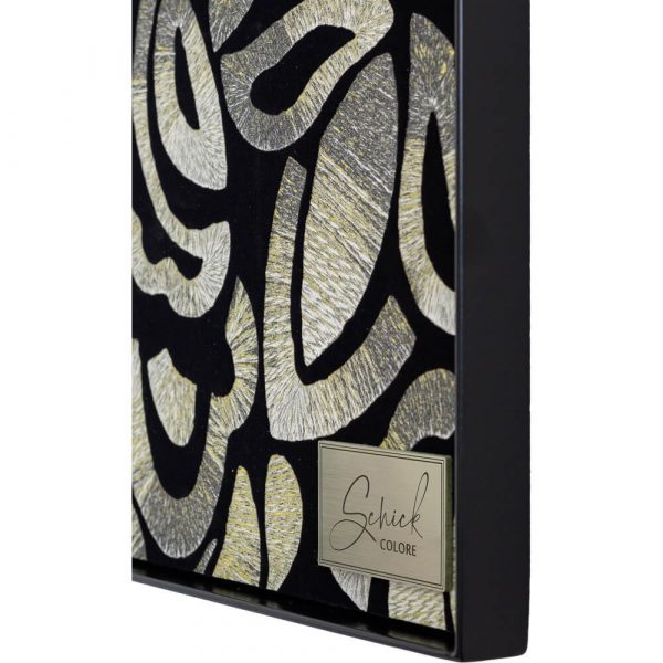 stabilen, matt schwarz gepulvertem Stahlrahmen mit einer Breite von 3 Millimetern und einer Tiefe von 30 Millimetern, in dem eine Holzplatte montiert ist.